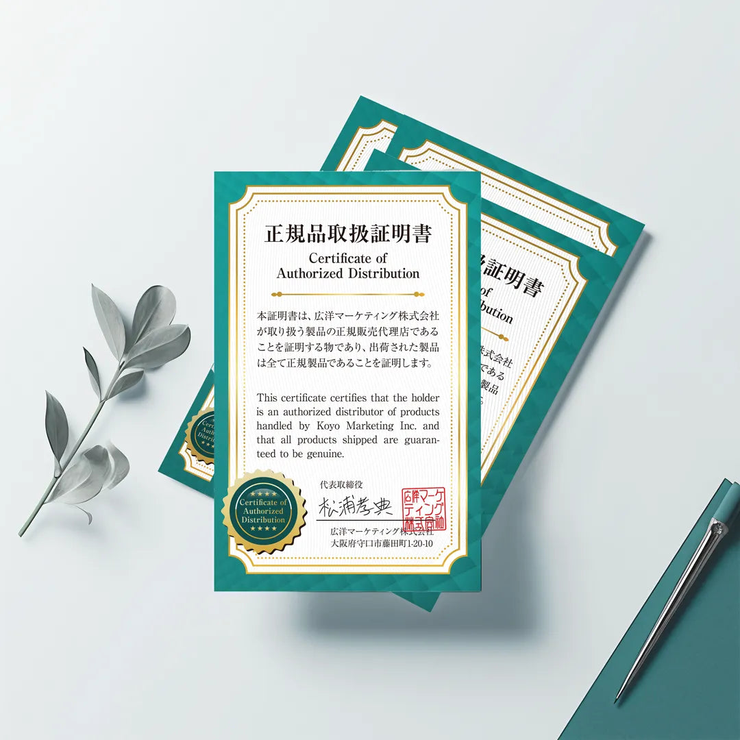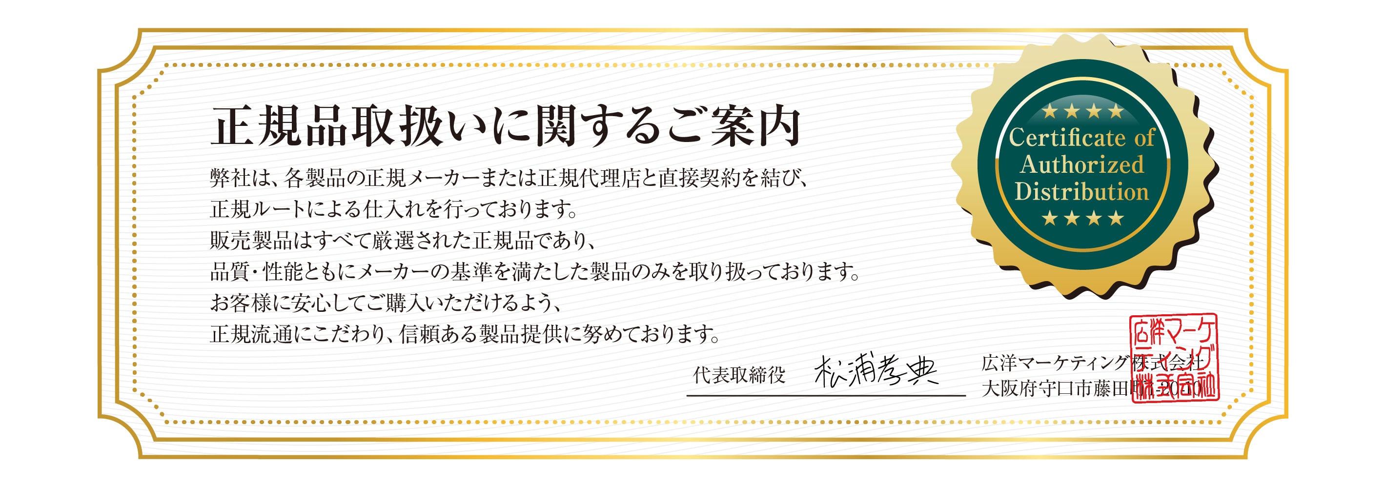 本証明書は、広洋マーケティング株式会社が取り扱う製品の正規販売代理店であることを証明する物であり、出荷された製品は全て正規製品であることを証明します。